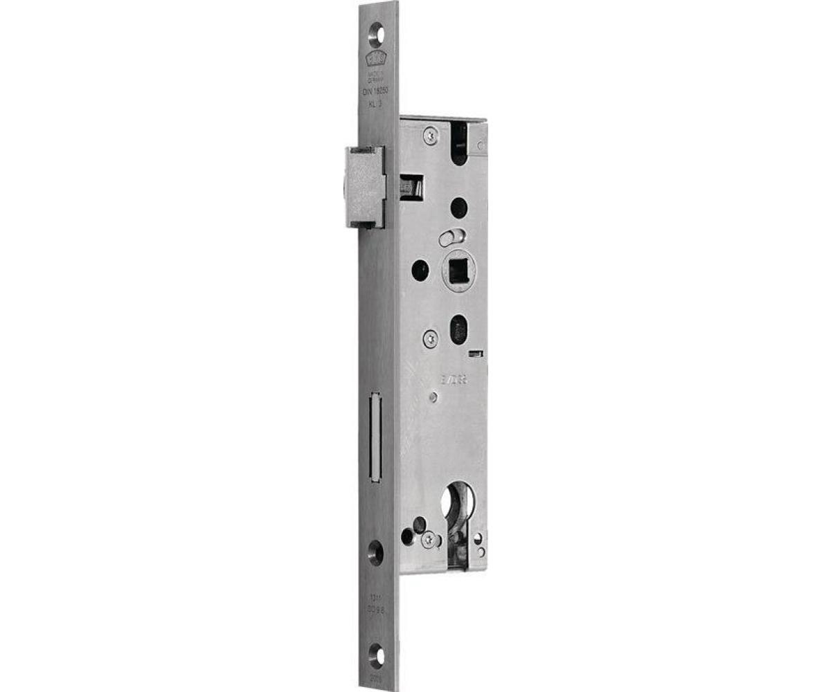 für einflügelige Türen · Stulp Oberfläche Edelstahl matt · zugelassen nach DIN 18251-2 Klasse 3 und EN 12209 für Feuerschutztüren · Falle aus Feinguss und Riegel aus Zink-Druckguss · 20 mm Riegelausschluss, 1-tourig · PZ · Entfernung 92 mm · 9 mm Vierkant · mit Wechsel
