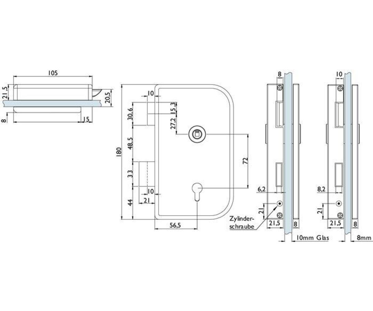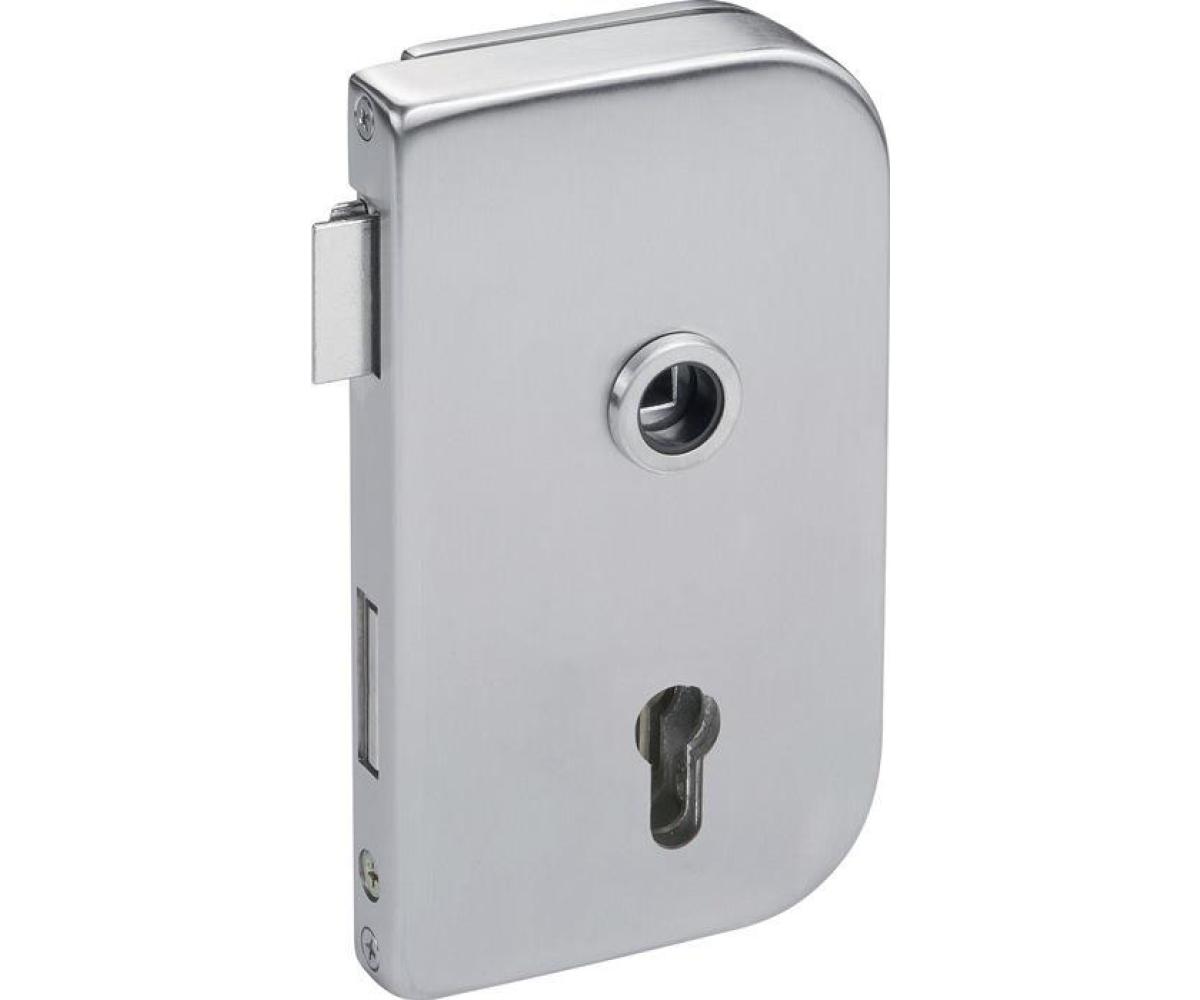 Grundschloss geprüft nach DIN EN 18251 Klasse 3 · Flüsterfalle · 2-geteilte Spezial-Klemmnuss · verschraubte Schlossabdeckungen aus Edelstahl · Zubehörbeutel mit Drückerführung 16 + 18 mm · bei diesem Schlosstyp ist die Angabe links oder rechts erforderlich · für 8 mm Glasstärke