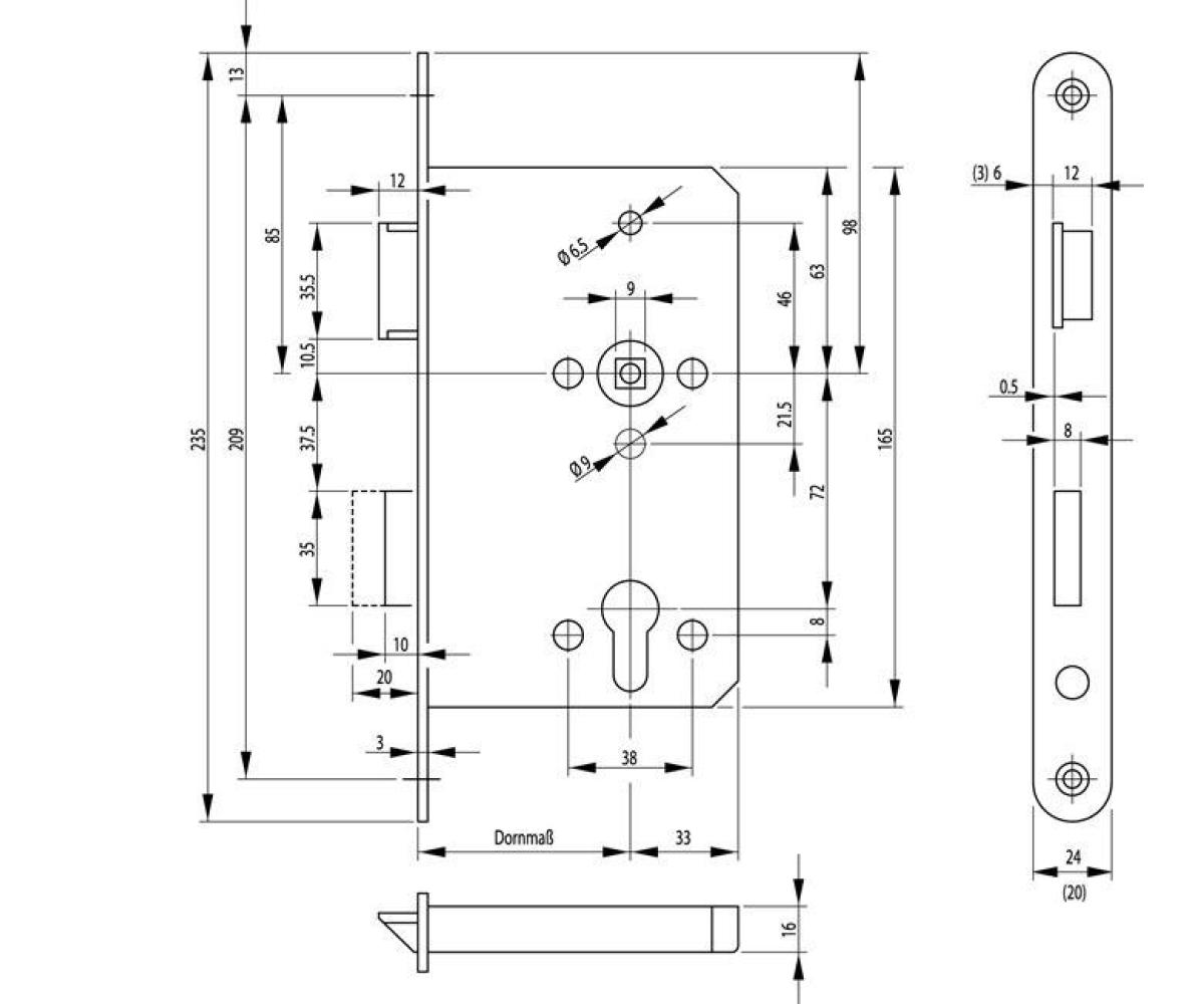 Weitere technische Eigenschaften · Riegel: Stahl · Norm: DIN 18250 · Schlosskasten: allseitig geschlossen · Riegelausschluss: 20mm · Falle: Stahl · Panik-Einsteckschloss · 1201 Fkt.E rd · 24/65/72/9mm DIN L ·