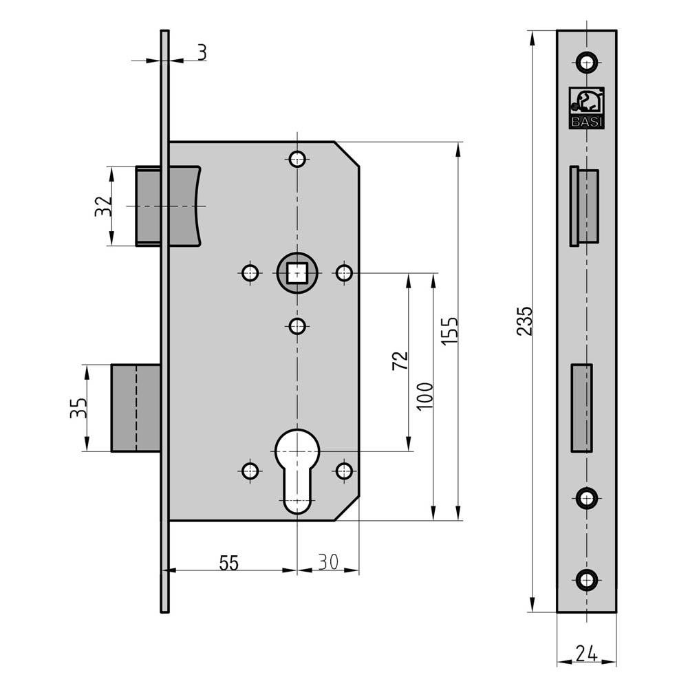 - Basi Einsteckschlösser entsprechen den Vorgaben nach DIN 18251-1, Klasse 2.